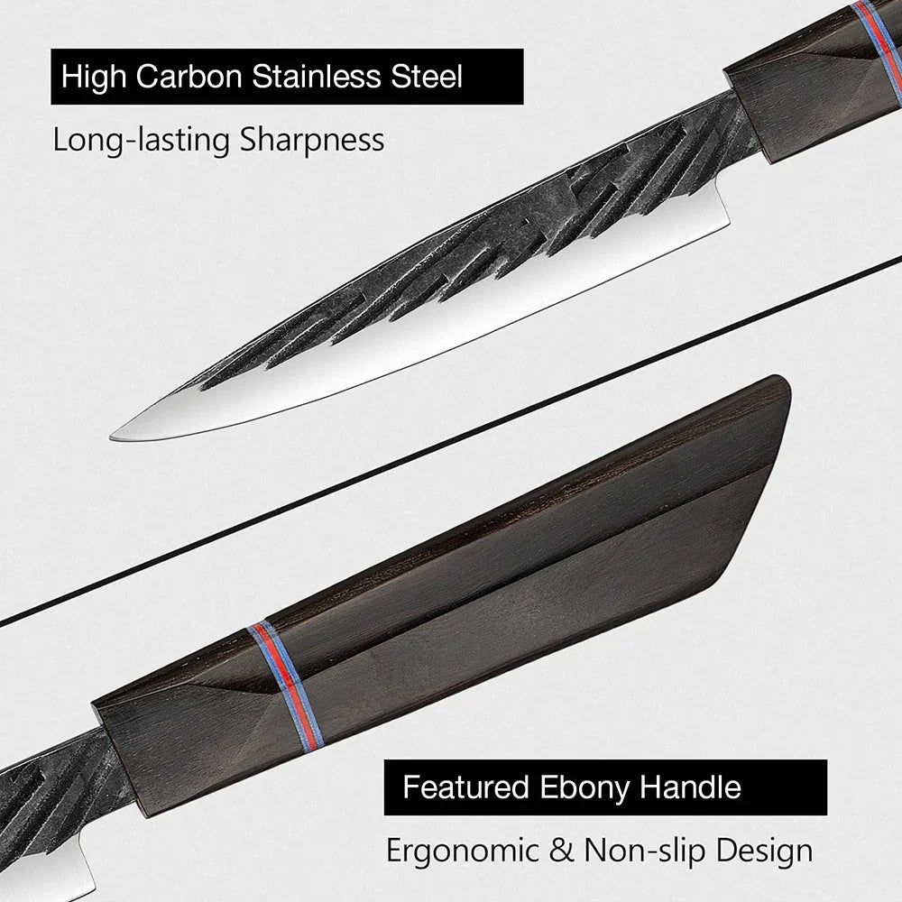 Introducing the Kurogane Petty Knife – a testament to unparalleled precision and elegance in the kitchen. Forged from premium steel, this Japanese-style knife boasts a striking dark, brushed finish on its blade, exuding strength and sophistication. The ergonomic sandalwood handle, crafted for a perfect grip, making it as comfortable as it is visually stunning. Elevate your cooking experience with the Kurogane Petty Knife – where artistry meets performance.
